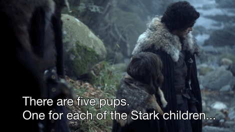 Al comenzar la serie, la familia Stark encuentra una camada de recién nacidos y los adoptan para que acompañen a cada uno de los hijos de Eddard. Así, Robb tendrá a GreyWind, Jon a Ghost, Sansa a Lady, Arya a Nymeria, Bran a Summer y Rickon a Shaggydog.