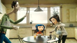 El otro mundo que visita Coraline parecen tener las respuestas a todos los cambios que desea en la vida. Todo es color, cuidado y jolgorio. La familia que se presenta en este supuestamente genial mundo (vale recalcar que la mansión es todo lo esperado) es atenta, imaginativa y ¡cocina!. El nuevo seno familiar (no muy humanos, por cierto, ya que tienen botones en lugar de ojos) le brinda a la protagonista diversión y, lo más importante, un sentido de pertenencia.
