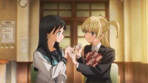 Este apartado es el más suculento de todos, pues el trabajo que CloverWorks hizo aquí es CELESTIAL. Hay un cuidado extremo al detalle, y es patente que Miyuki Kuroki está en la dirección, pues su experiencia en joyas como Fate/Grand Order y Occultic;Nine dejan patente que no se ha descuidado «ni el dedo chiquito» de la más humilde de las chicas de esta secundaria… y en este caso hablamos en un sentido literal.