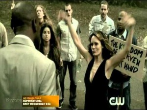Por otra parte nos encontramos con Sam, quien tiene, nuevamente, una visión con Lucifer. Comienza a preguntarse si esa es la respuesta, y orando pregunta si eso es lo que él quiere y obtiene una respuesta: se prende fuego un zarza (tal como aparece en la Biblia).
