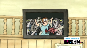 8 La película Cena de Zombies, por la que Rigby batalló para conseguir las entradas, es un homenaje a The Walking dead y al videojuego Resident Evil.