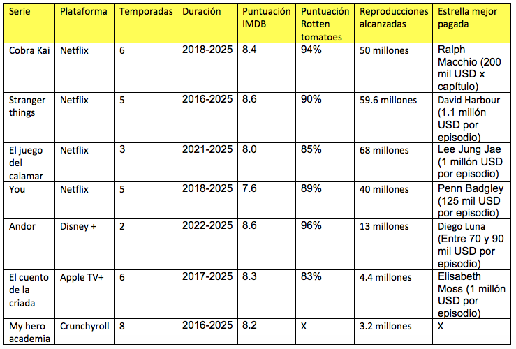 De acuerdo con la numeralia arrojada dentro de esta investigación hecha por Spoiler, El juego del Calamar y Stranger Things se coronan como las serie más exitosas del 2025 con una audiencia de 68 y 59.6 millones de espectadores y con algunas de sus estrellas alcanzando una paga de más de 1 millón de dólares por episodio.