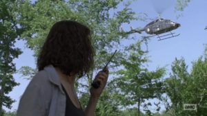 Para ser más precisos, han habido varios avistamientos de helicópteros en The Walking Dead, pero la mayoría está de acuerdo en que este helicóptero en particular aparece por primera vez en el episodio de la temporada 7 cuando Rick visita por primera vez el hogar de Jadis / Anne. La escena tiene a Rick mirando hacia el enorme vertedero y lejos, en la distancia, se puede ver un helicóptero moviéndose de derecha a izquierda. Algunos asumieron que era simplemente un error, solo un helicóptero totalmente normal que se había capturado accidentalmente con la cámara. Pero esa escena se filmó claramente frente a una pantalla verde y no en ningún lugar que pudiera aparecer accidentalmente un helicóptero al azar.