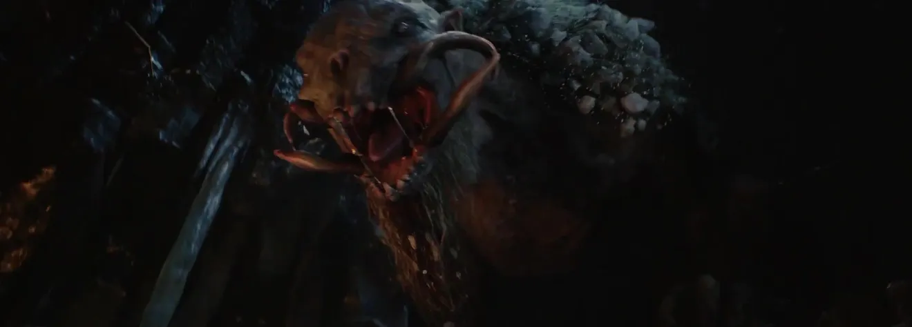 Si bien Sauron no aparece, se nos presenta a un monstruo gigante enfrentando a una persona que porta una antorcha. Esta figura está vestida con los mismos grises que Galadriel, lo que quizás indica alguna conexión entre los personajes.