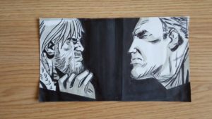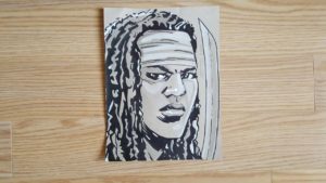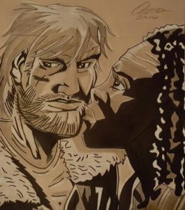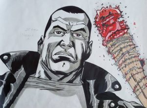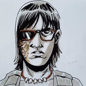Por ejemplo, tomó los personajes de Rick y Michonne y los dibujó juntos, tal y como sucede en el show, aunque nunca haya pasado en la historieta. Por otro lado, en el cómic, Abraham tiene el tipo de muerte que acaba con Denise en pantalla, sin embargo, decidió ser fiel a lo visto en AMC. Del mismo modo, el diseño de Eugene tiene algo de Josh McDermitt en su rostro. Veamos algunas piezas de su autoría; también puedes visitarlo en redes sociales como Twitter.