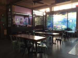 Esa bellísima pintura que puede verse en el famoso café Monet fue puesto encima de un gran vidrio vacío que dejaba entrara demasiada luz al set.